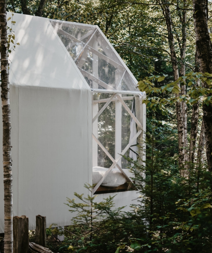 La plus grande portion translucide en glamping s’agrandi encore en ajoutant les versants de toit et les portions latérales avant à votre devant vitré. Cela offrira une vue imprenable sur les étoiles, le ciel et la nature environnante. À noter que la portion translucide incluse dans le toit panoramique est interchangeable avec une section opaque afin que l’unité s’adapte au changement de saison et puisse recevoir l’ensemble plafonnier thermique.